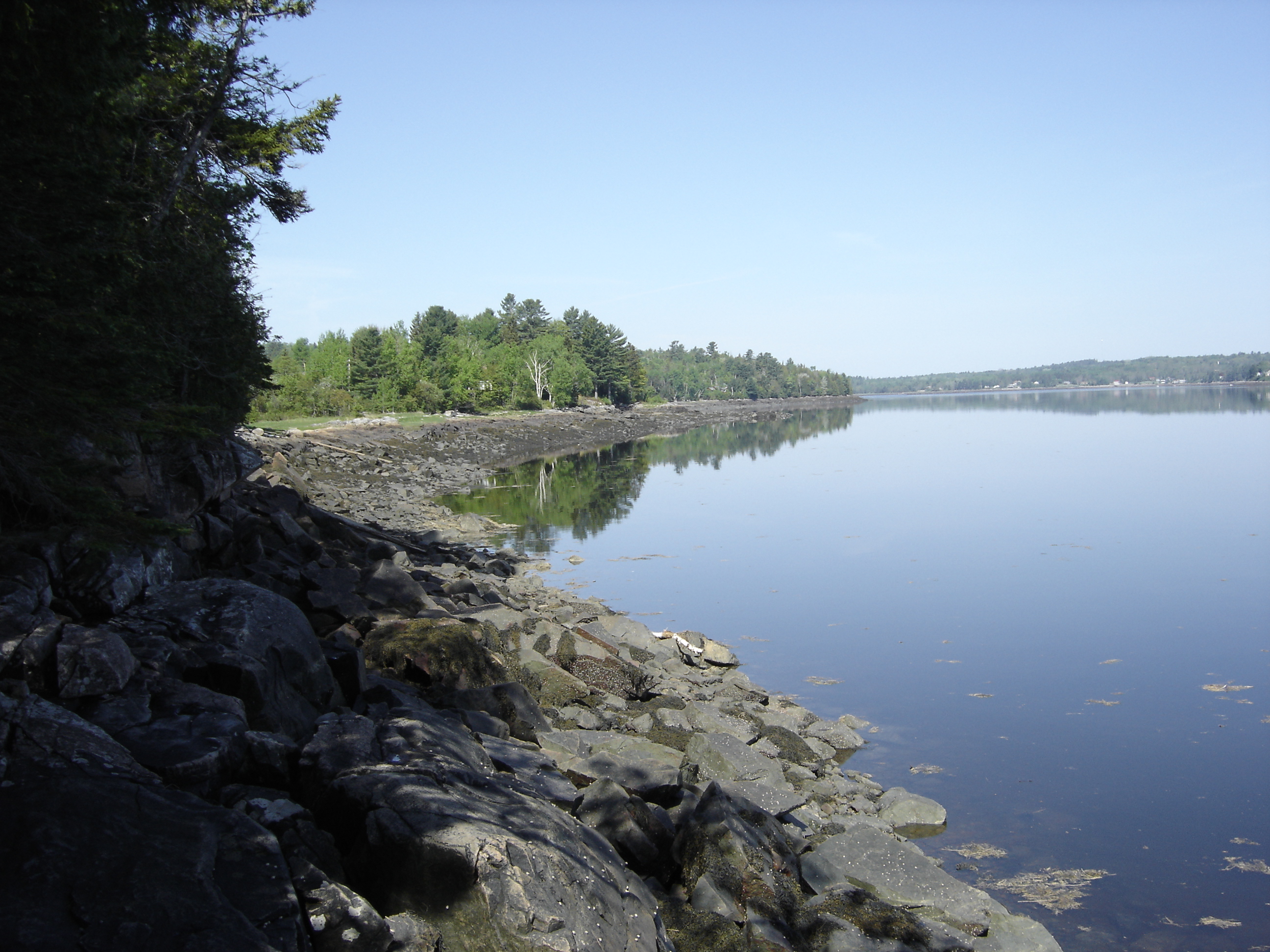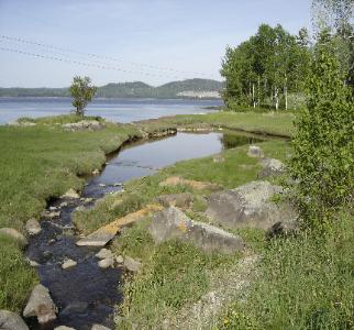 | The Brook The Seure DuMont Brook meanders from the Devils Head Conservation Area across the combined property through the Apple Orchard and the Field to a tidal pool at the edge of the St. Croix. The tidal pool is a shared view of the two properties and is seen here (Left) from the Primary Residence looking west from the deck past the Picnic Grounds across the wetland area that surrounds the pool. Also seen (Right) from the western access road to the Corporate Guest Residence property. The neighborhood Kingfishers, Red-Wing Blackbirds, Bald Eagels and a family of Osprey from the conservation lands are especially fond of this spot. |