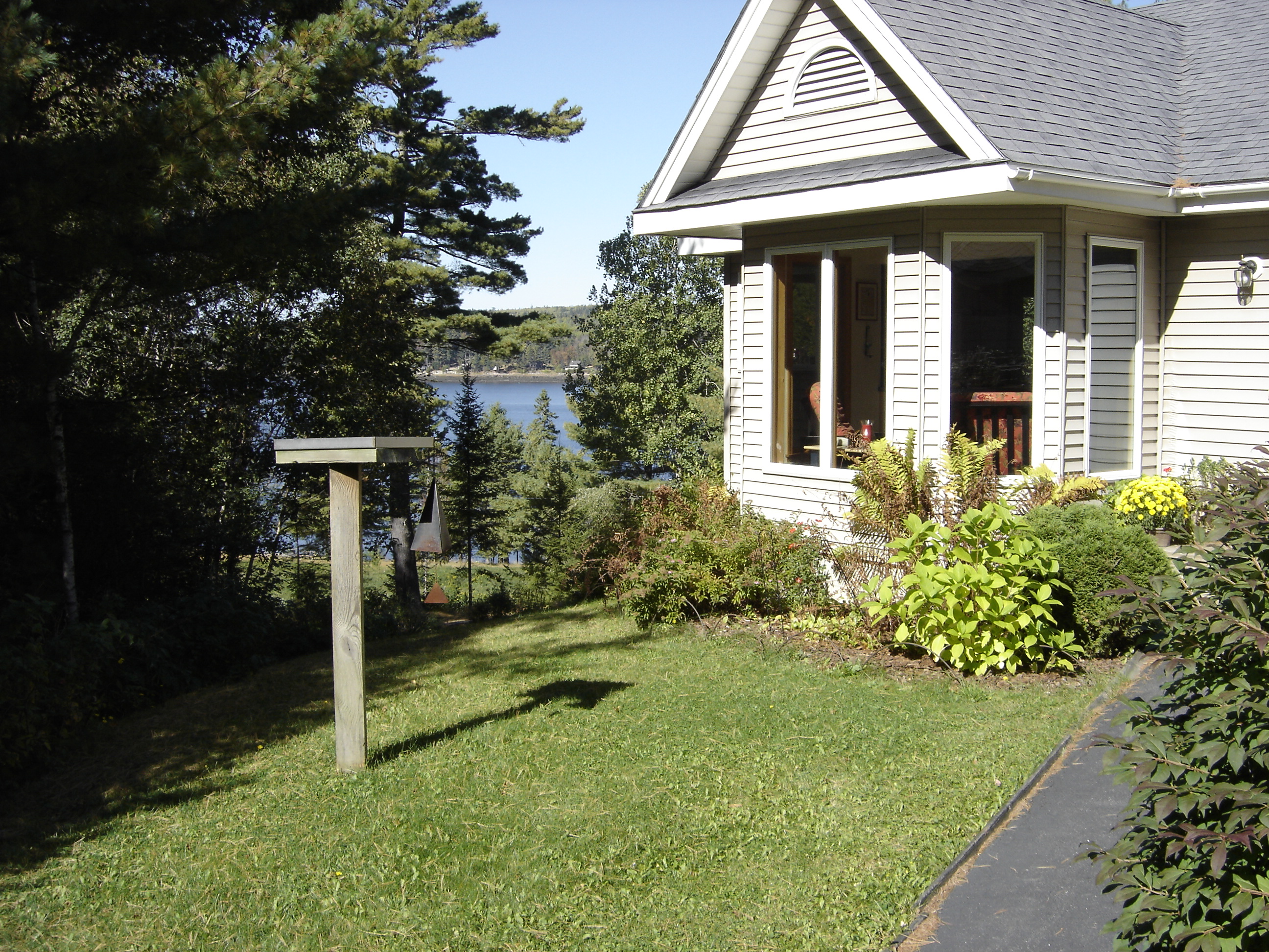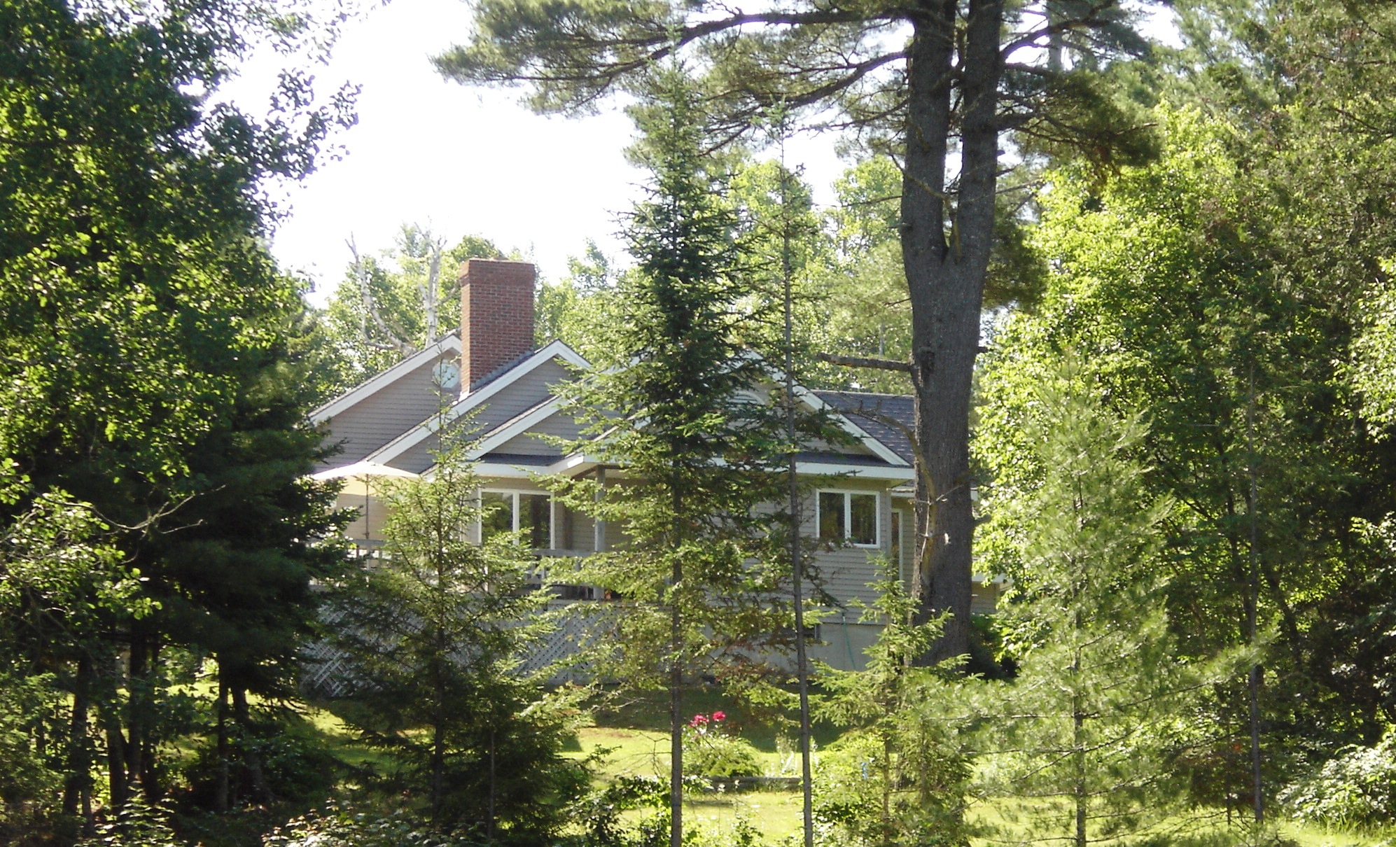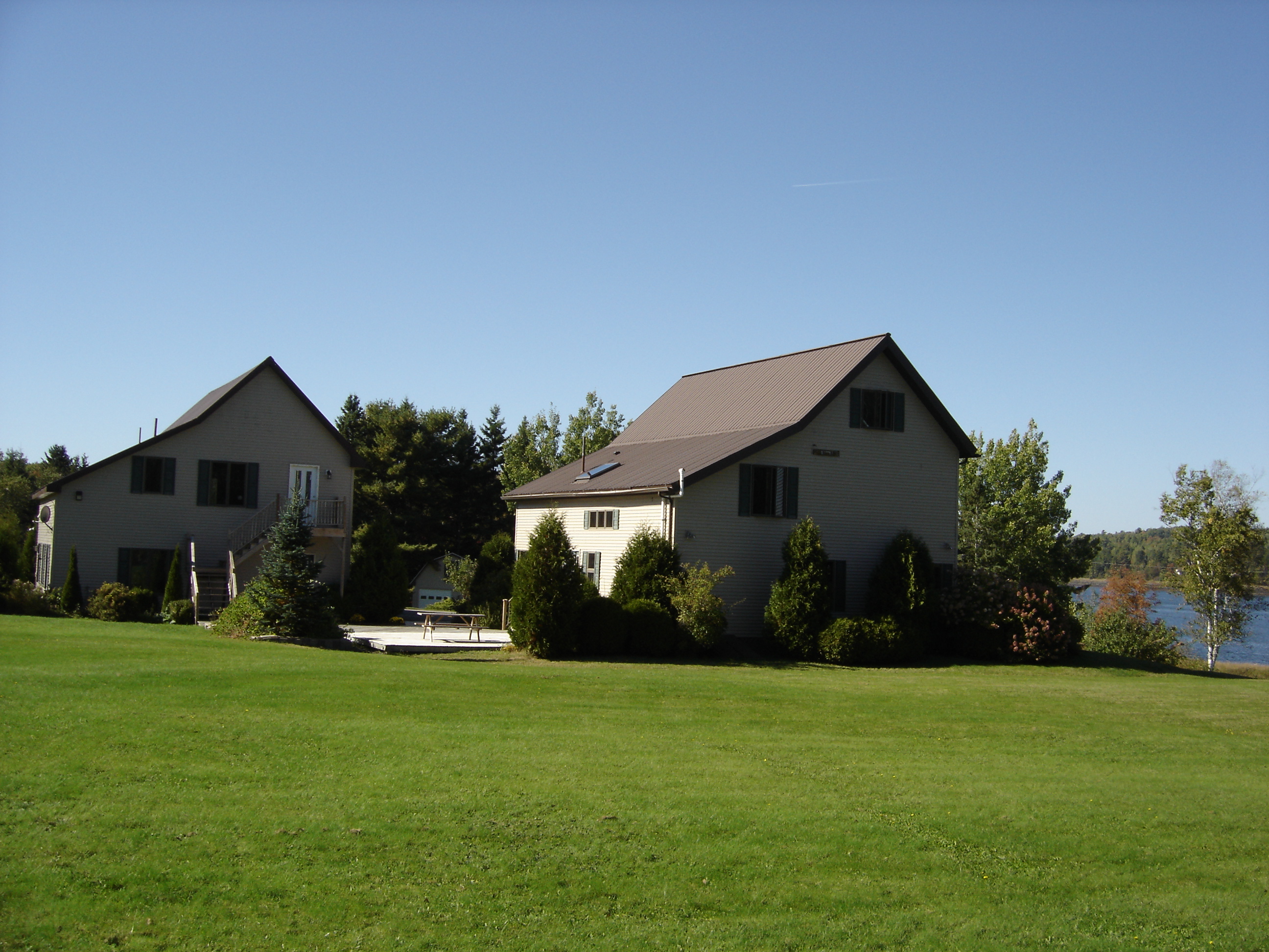 | The Atlantica GreenSource Corporate Guest Residence A View of the Main House and The Studio seen from the eastern access road to the Primary Residence. Both structures have been fully renovated by Atlantica GreenSource in 2007 and can comfortably host ten or more guests. The twelve acre property is comprised of extensive gardens and lawns that run from the Apple Orchard down to the shore. A stunning view of the tidal pool seen from every window of both the Main House and The Studio looking north across the river to Canada is shown below. |